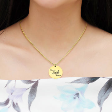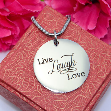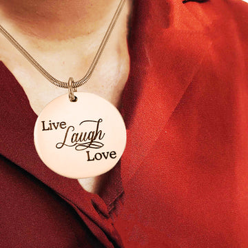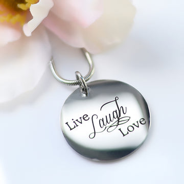 Looking for a unique necklace that'll inspire you to live life to the fullest? That's me. I'm the Live Love Laugh necklace. My shiny disc is elegant and time less. Surprise your loved one, take me home as their gift. Or maybe you'd like me all for yourself.