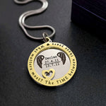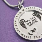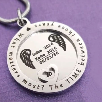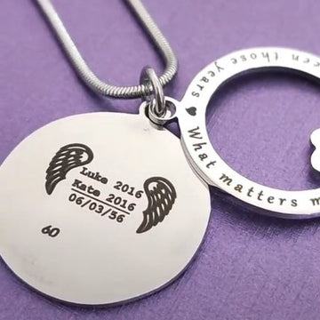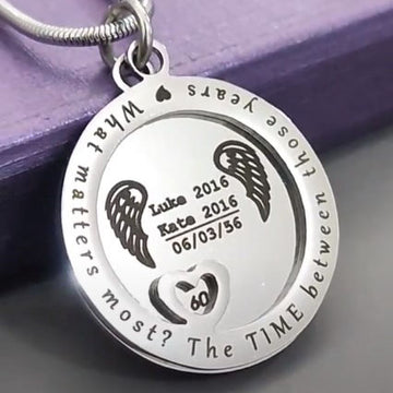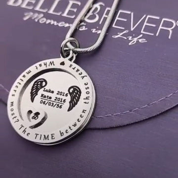 This elegant necklace allows you to inscribe their name and key dates alongside the message, 'You're Always on My Mind'. The round pendant features a little heart shape inside, symbolising never-ending love, and angel wings inscribed on the disc representing hope and faith.