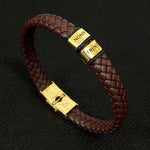 The bracelet features a thick brown leather band that is solid and thick, giving it a premium feel. The steel plate on the bracelet can be inscribed with a name, date, or symbol of your choice, allowing you to create a truly unique and personal gift that will be treasured for years to come. The plate is securely fastened to the leather band with a small rubber, ensuring that it stays in place and remains looking great even after years of wear.