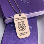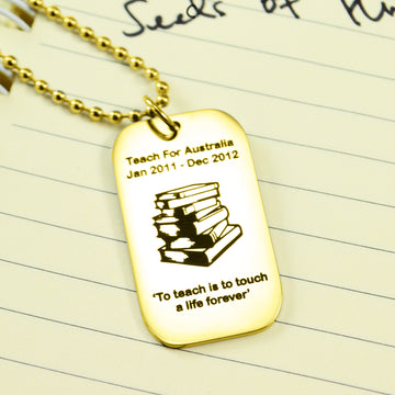 Show your teacher how much you appreciate them with our Personalised Dog Tag Necklace especially made for Teachers. This rectangular shaped pendant comes in silver, gold, and rose gold tones and features a pile of books symbol. You can personalise the front and back of the pendant with a name and date of your choice. Plus, we offer a design layout service that allows you to work with our designer to create a custom design with up to three revisions included.