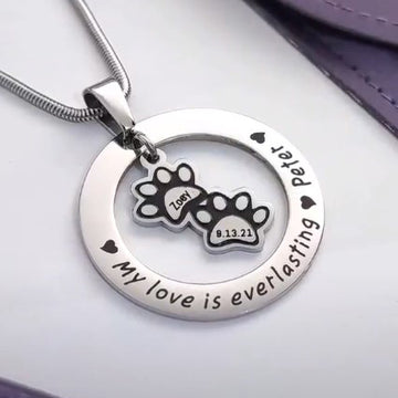 This necklace is fully customisable, allowing you to personalise it with your pet's name on the paw pendant and your message on the circle pendant. Available in Silver, Gold, or Rose Gold, this necklace is perfect for any outfit or occasion and is guaranteed to complement any style.