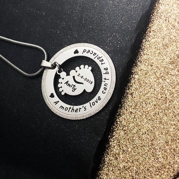 No matter how big they grow, your children can never be replaced. The pitter-patter of their little feet is the sound that remains etched in your heart. That's why I exist. I'm the Sparking Can't Be Replaced Necklace. I'm the perfect gift for a new mum. Personalise each foot with the little one's name or birth date—or both!